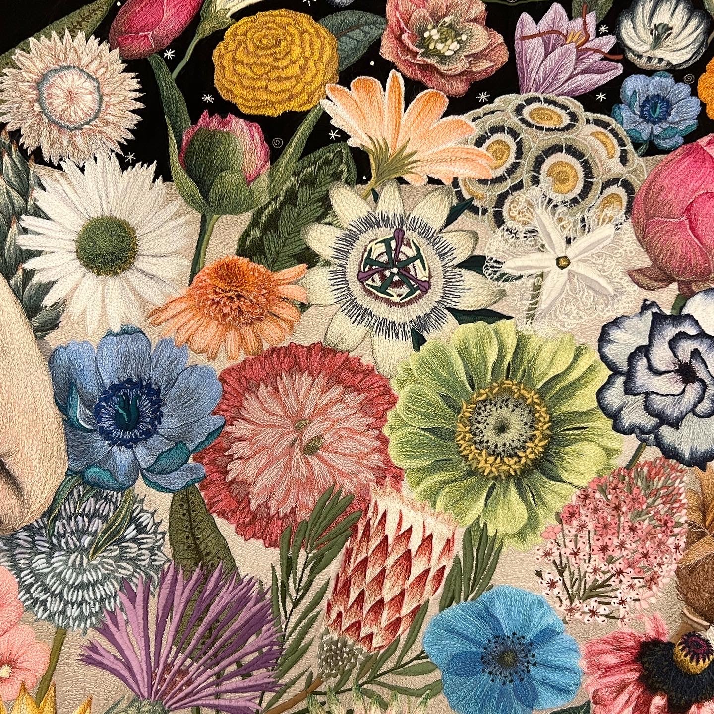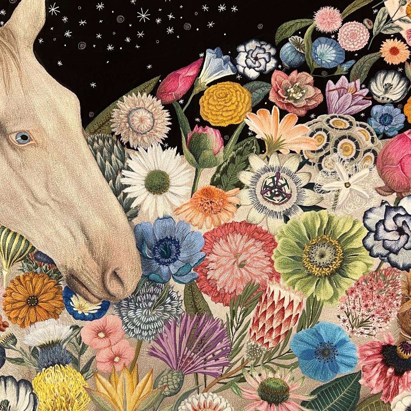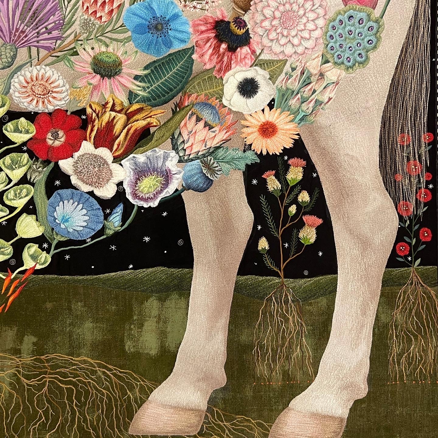 The medium includes fabric appliqué and embroidery techniques done on a simple, mechanical sewing machine. Each original piece is made entirely of contemporary fabrics and thread.