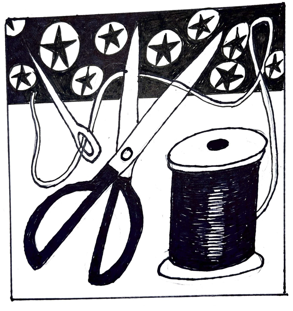 The medium includes fabric appliqué and embroidery techniques done on a simple, mechanical sewing machine. Each original piece is made entirely of contemporary fabrics and thread.